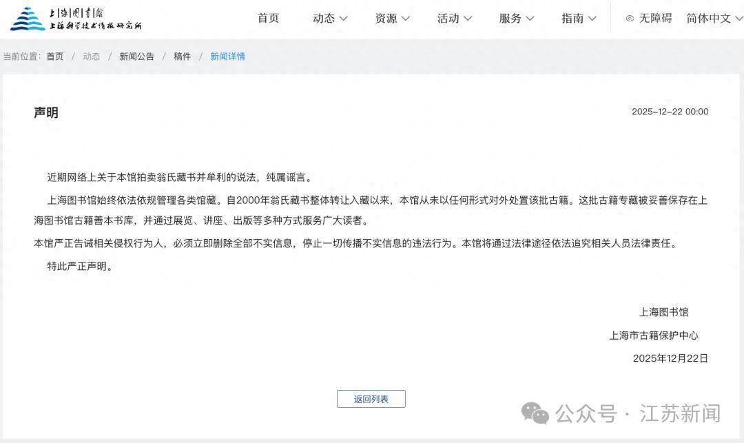 - 上海藏书楼严正声明:拍卖翁氏藏书并营利的说法熟练流言 2025-12-24